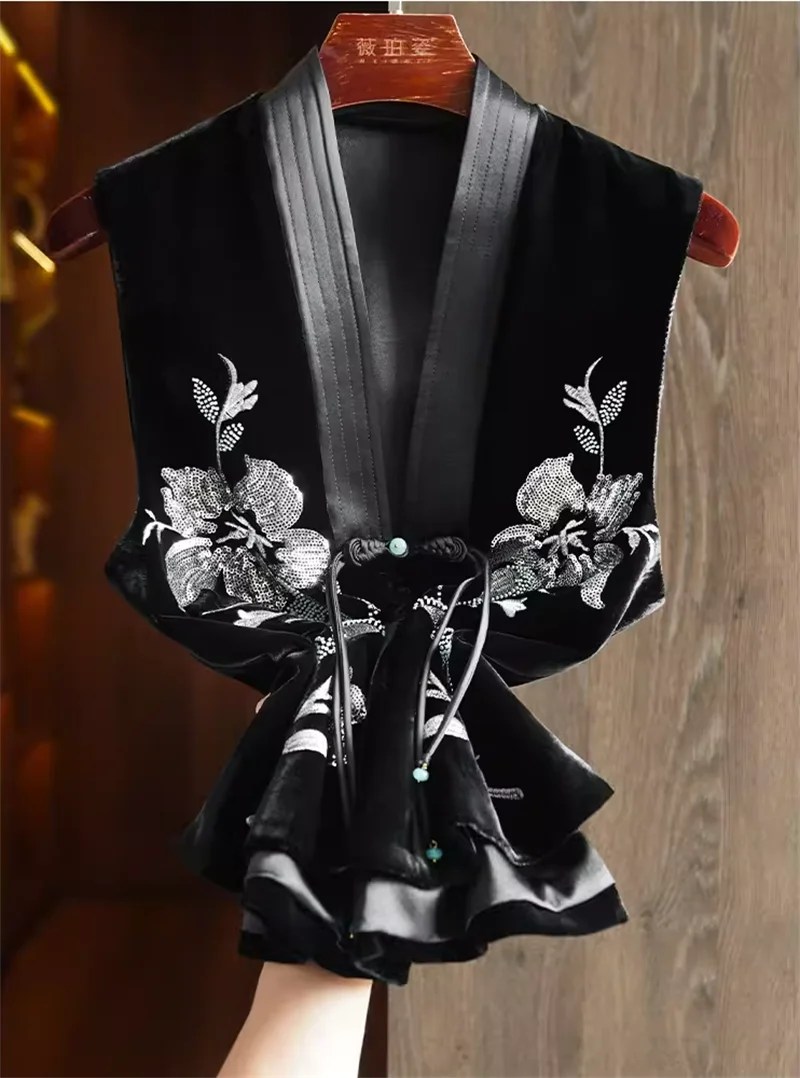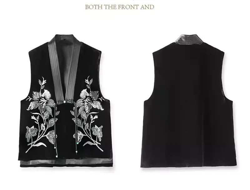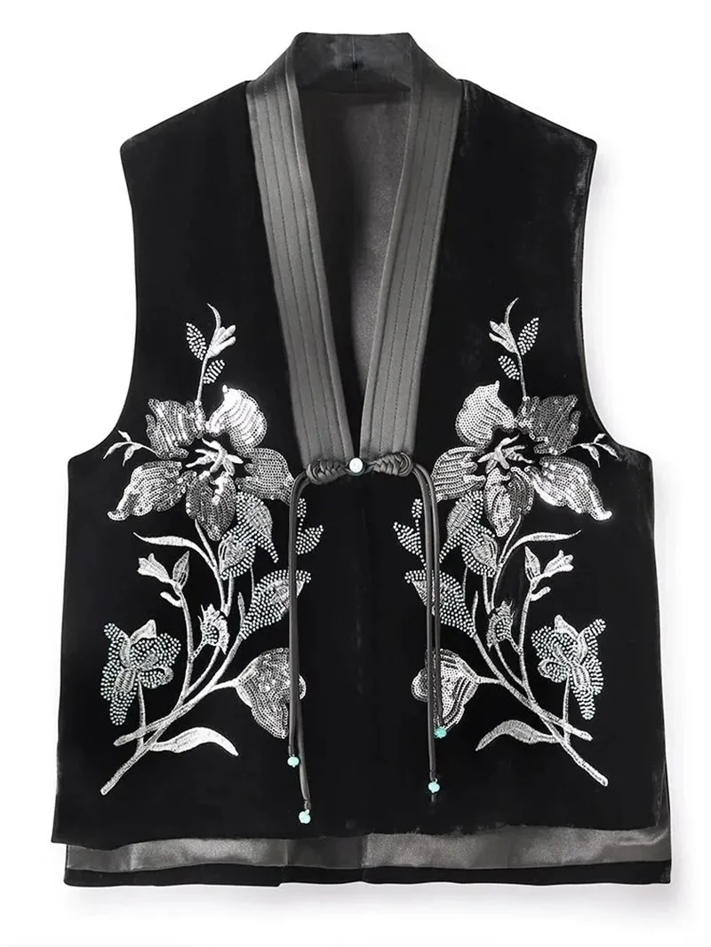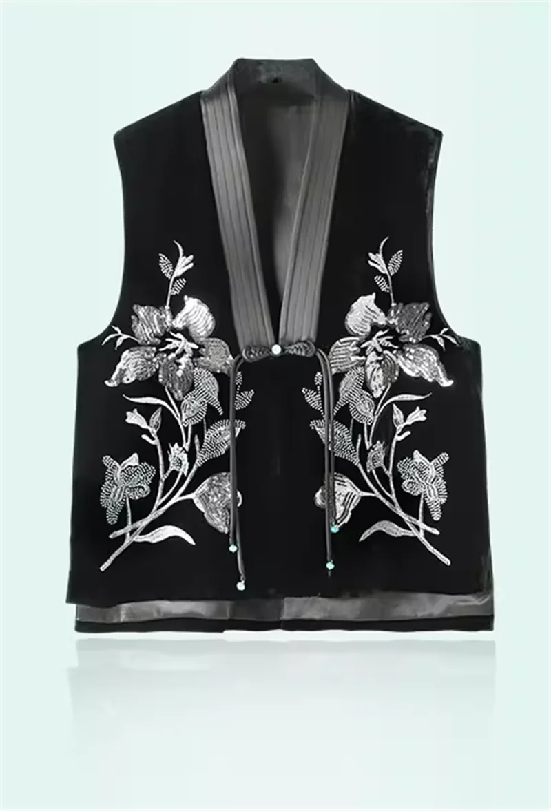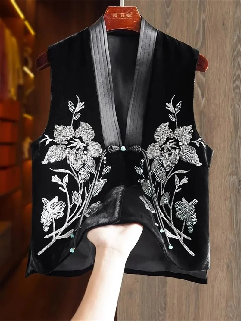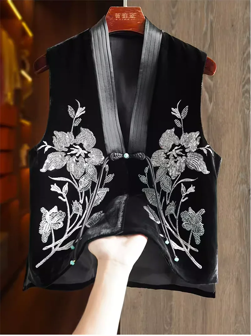 Colete de veludo de seda chinês feminino, bordado frisado, estilo nacional, casaco de fivela, coletes de veludo feminino, coletes high-end, novo